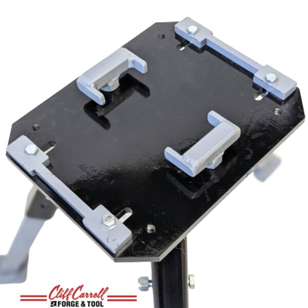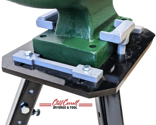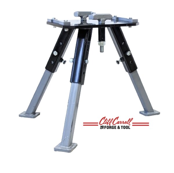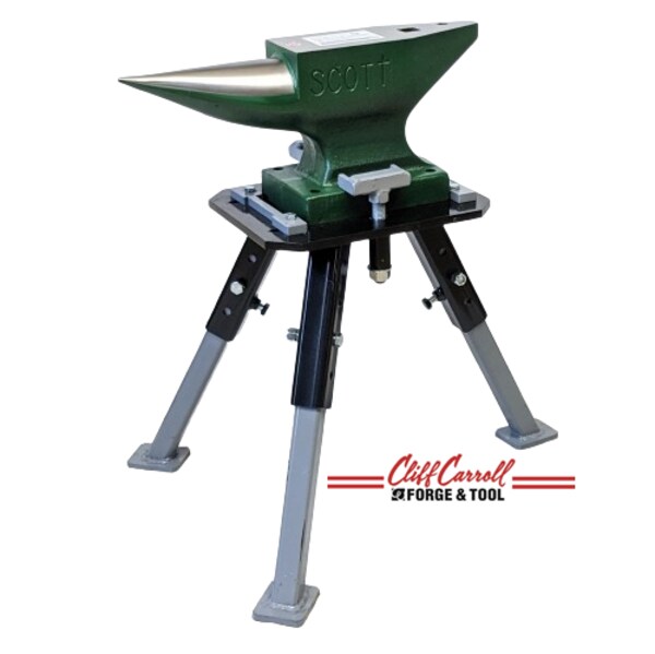 The Cliff Carroll Tri-Pod Anvil Stand will accommodate any square base Scott anvil. Unlike other anvil stands, the Carroll stand features adjustable bars on the face of the stand that keeps your anvil from twisting and moving around. The specially designed hold down bars are designed specifically for the Scott 75lb Mini Boy, Scott 100lb Square, Taper or Cam Heel anvils . This ensures that your anvil is locked down and won't bounce or rattle loose. The Carroll Tripod Anvil Stand is adjustable in height and features lock down bolts to take away any movement in the legs. Heavy duty yet portable. Shipping weight 63lbs.