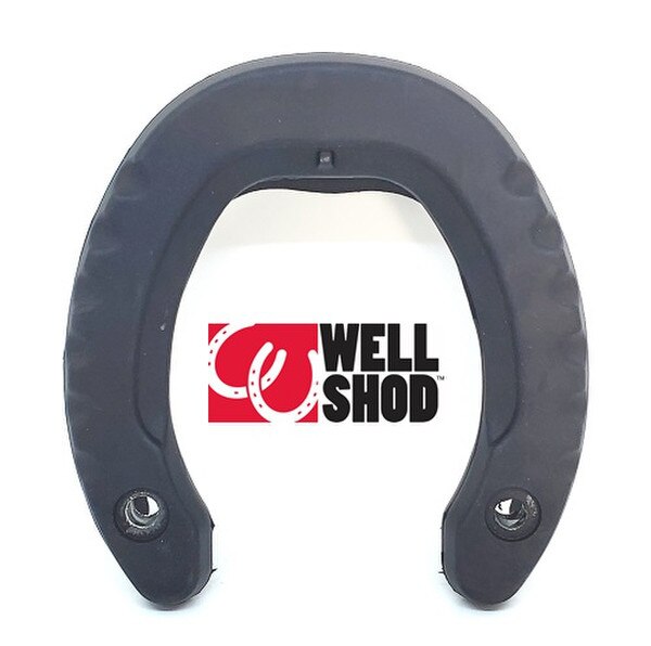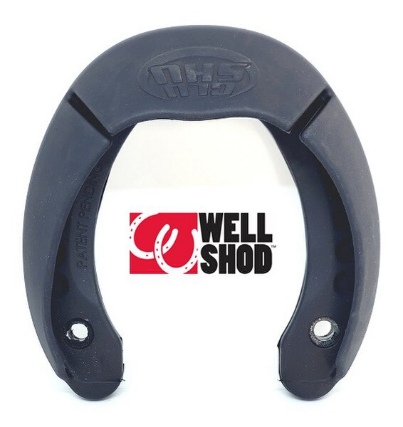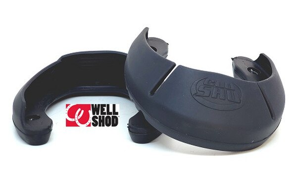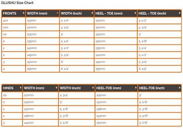 GLUSHU is an advanced aluminum shoe, over molded with a flexible cuff. This gives the horse a light, hoof supporting, cushioned shoe which eliminates any stress or damage to the horse's hoof and is easy to apply. *Front can be cut away to allow breakover. *Bottom can be ground to give breakover at the front of all the way around. *Lines inside the shoe help it flex. *Inside base bonds the hoof to the shoe. *Rubber forms a cushion effect for sore hooves. *Stud holes to give extra grip when needed. *Outer ridge on the base provides extra lateral grip. How to Measure the Hoof: 1. After a normal trim, measure the width of the hoof at the widest point. 2. Measure the length of the hoof from the toe to the buttress line. This is where the hoof wall ends. Do not include the heel bulbs 3. Compare your measurements with the size chart. If the width and length measurements differ from the size chart it is recommended you choose the larger of the 2 sizes. **ADHESIVE SOLD SEPARATELY** Recommend Glue-U Shufit Adhesive.