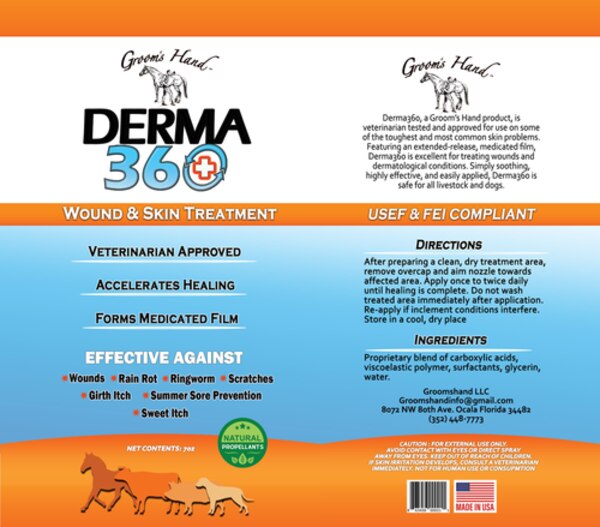 Derma 360 Wound & Skin Treatment by Groom’s Hand is a veterinarian-tested and approved aerosol spray for some of the toughest and most common equine skin problems. It features an extended-release medicated film that soothes, heals, and protects. This non-toxic, steroid- and antibiotic-free formula increases oxygen at the wound surface, helping to inhibit pathogen growth and trigger healing. Offers continuous even spray at any angle and is safe for all livestock and dogs.