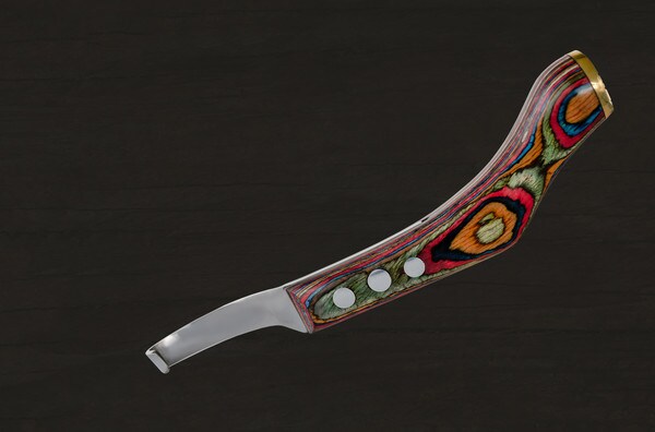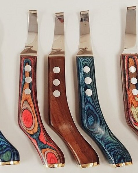 JONATHAN NUNN HOOF KNIVES These Straight and Drop blade knives are a unique design made from high quality British steel. The comfortable handle grip resembles a pastern, the brass horseshoe positioned on the handle butt is very useful when hot fitting or applying pressure to the hot shoe without damaging the shoe. This is a strong, high quality knife manufactured with Jim Blurton's knowledge and experience combined with Jon Nunn's innovative farriery concepts. A unique Loop knife design made from high quality British steel with a long curved blade and a narrow tip. Unlike other loop knives, this versatile blade enables the knife to go deep into the frog clefts when trimming. The Abscess loop knife is especially designed to allow you to carefully track abscesses or remove damaged or infected hoof wall or sole. Ideal for when trimming acute laminitics and when careful removal of horn is required close to the sensitive structures.