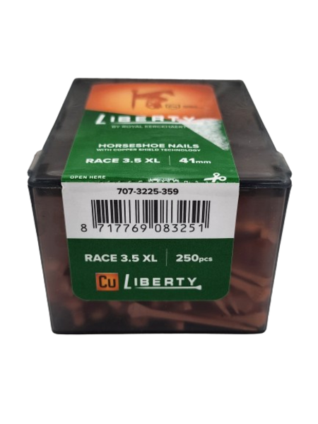 LIBERTY CU COPPER RACE NAILS 250CT BOX Cutting edge technology Hoof/Horn quality improves Reduces rust and wear inside the hoof wall Healthier hooves Ideal for all horses Competitive price Nail Length: SIZE 3.5- 35.5mm, 3.5XL-41.00mm, 4.5-44.0mm, 5-47.0mm 250CT boxes and 24 boxes in a case sizes 3.5 thru 4.5, size 5-12 boxes to a case. **BUY A FULL CASE AND SAVE 7%**