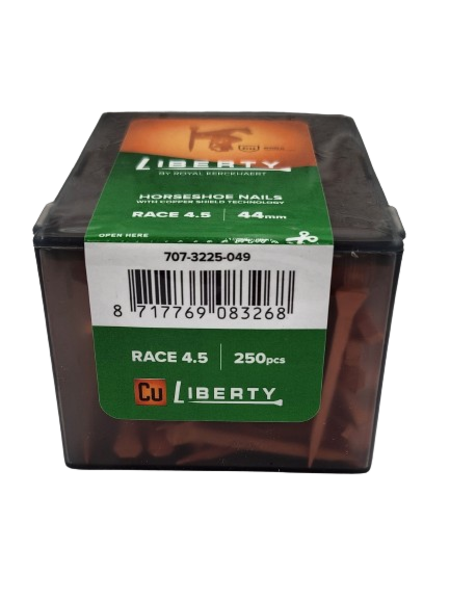 LIBERTY CU COPPER RACE NAILS 250CT BOX Cutting edge technology Hoof/Horn quality improves Reduces rust and wear inside the hoof wall Healthier hooves Ideal for all horses Competitive price Nail Length: SIZE 3.5- 35.5mm, 3.5XL-41.00mm, 4.5-44.0mm, 5-47.0mm 250CT boxes and 24 boxes in a case sizes 3.5 thru 4.5, size 5-12 boxes to a case. **BUY A FULL CASE AND SAVE 7%**