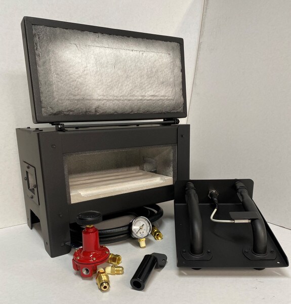 The Mighty Forge Features: Two burners, individually controlled with stainless steel burner tips Main body is made with premium 12 gauge hot rolled steel The inside firebox dimensions for The Mighty are 11.5" W x 7.5" D x 3.5" H 3" X 1.5" side ports for bar stock to pass through Fuel type - Propane with operating pressure of 2 to 15 PSI Interior fire box lined with 2600 Thermo-Tect HT Board. A one piece poured floor made up of a light weight 80 compound Capable of forge welding in minutes Large 2" insulated front door Weight: 60 lbs Also comes with a 10' hose, Self Regulating 0-35 Lbs propane regulator and gauge Mighty Hot, Mighty Quiet,Very Efficient and have a very low scale build up when forging. Made in Canada **OVERWEIGHT SHIPPING** - A $25.00 OVERSIZE FEE WILL BE APPLIED AT CHECKOUT.**