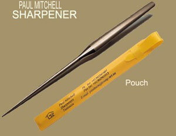 Paul Mitchell Knife Sharpener With it's tapered conical end the Paul Mitchell Sharpener will fit the smallest of loops to the largest. The wider dual tapered elliptical end with it's radius ground edges will allow you to obtain the perfect cutting edge on any type of knife. The sharpener comes to you in a heavy duty PVC pouch. It is important to keep your diamond sharpener clean and unclogged. Always use a petroleum-based liquid on the sharpener during use.