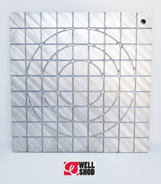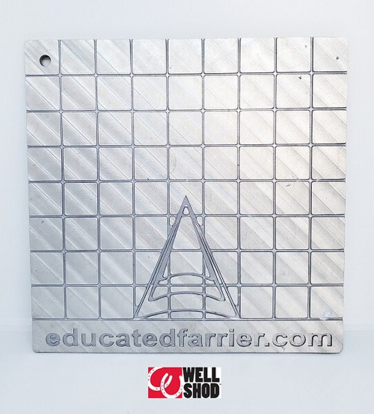 Shoe Layout Plate This aluminum plate is 1/4" thick, 10"x10" and weighs 2.35 lbs. The grid pattern has exactly 1" squares on both sides and is very useful in developing an eye regarding shoe shape. The back side of the plate can be used as a small layup table for blacksmith projects. Several plates can be combined to assist for large scale jobs.