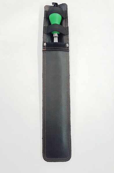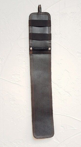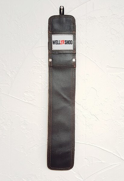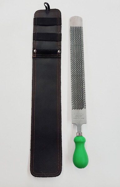 WELL-SHOD LEATHER RASP COVER Protect your rasp with this leather rasp cover. Eye catching black leather cover with contrasting orange stitching. This rasp cover has a loop so you can hang up the rasp while in the cover. There is also 2 elestic bands to protect the rasp handle while stored. Fits most raps.