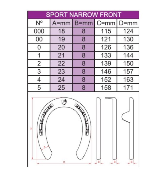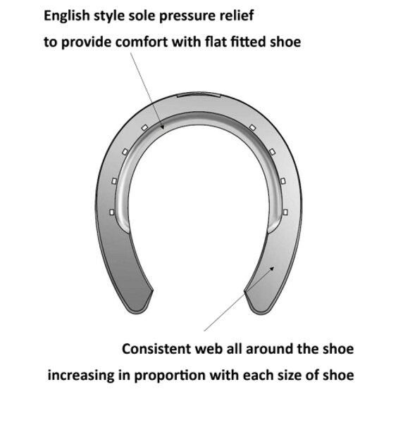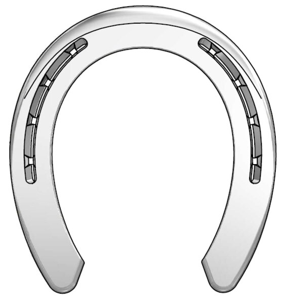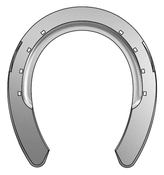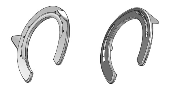 This collection is designed to help farriers meet the requirements of horse locomotion specialists. It provides biomechanical features necessary to maintain optimal comfort and soundness across various equestrian disciplines. The different sport collection models will help you attain such goals while reducing the need for added modifications to keg shoes. Available toe clipped or side clipped. Front shoes come with two different shapes and hind shoes come with one shape that will easily fit most of sport horses’ feet. Hind shoes are right and left shaped. The lateral branch is marked with a small groove in the inner rim. Front shoes are universally shaped.
