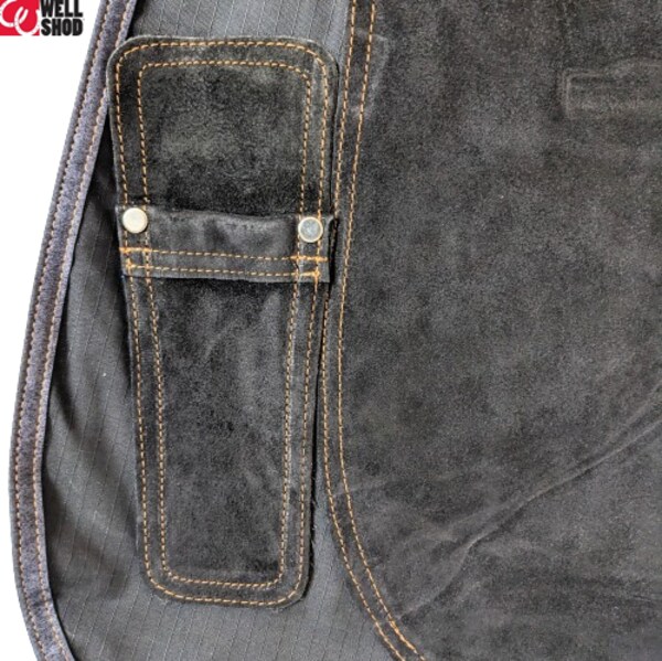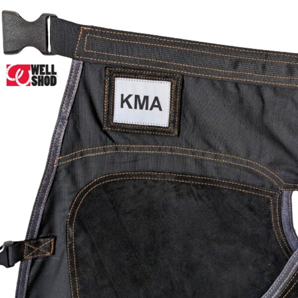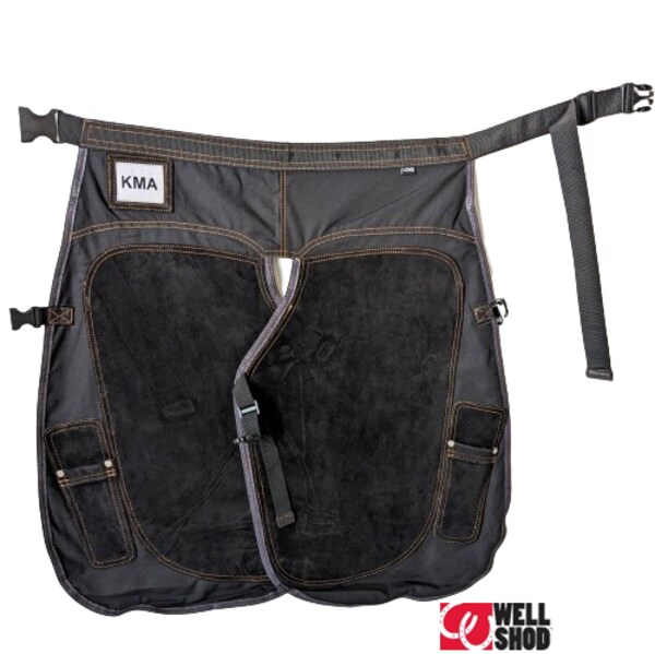 This KMA apron is made of high quality leather and canvas. There is one knife pocket on each side of the apron. There are no magnets on this apron. Heavy duty buckles are located at the thigh and waist for durability. The apron does not have a back support only an adjustable belt to get the perfect fit. One size fits most. 29" long x 16-3/4" wide (at the thigh buckle).
